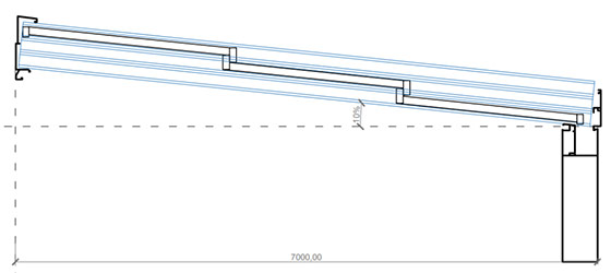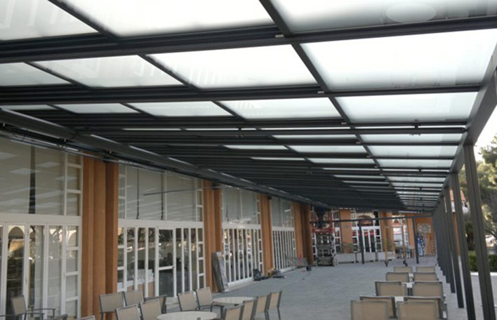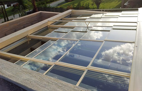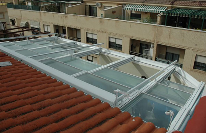 El cristal cámara del que está compuesto mejora la eficiencia térmica y energética frente a un cristal de seguridad. El diseño de sus perfiles y de sus hojas estructurales permite una perfecta evacuación de aguas que evitando así filtraciones y acumulación de agua en el techo.